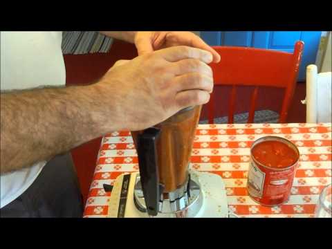 Put your peppers in the blender and then the canned tomatoes (including juice). IMPORTANT NOTE: you don't need the entire second can - only half of it. Finding small (14oz) cans of whole tomatoes is sometimes hard, so just buy two 28 oz cans. Also, be careful when buying these tomatoes. Some have basil, garlic and other seasonings included. You just want the plain ones, although there will be some salt added.
